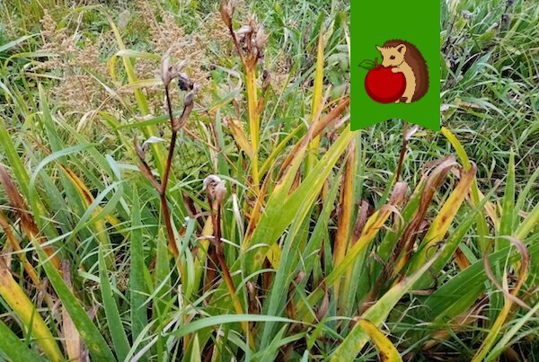2. Листья ирисов необходимо срезать чуть позже цветоносов, непосредственно перед заморозками (я делаю это обычно во второй половине октября). Торопиться не стоит: зелень должна фактически полностью пожухнуть и увянуть. Резать зеленые листья не надо, иначе вы подорвете процесс фотосинтеза, а ирисы должны успеть запастись питательными веществами. Срезать листья необходимо на расстоянии 10-15 см от точки роста, формируя из них подобие веера. В таком случае в местах срезов будет скапливаться меньше влаги, мы снизим риск загнивания луковиц и корневищ. Полностью высохшие листья убирать нужно целиком, не оставляя "пенечков".
