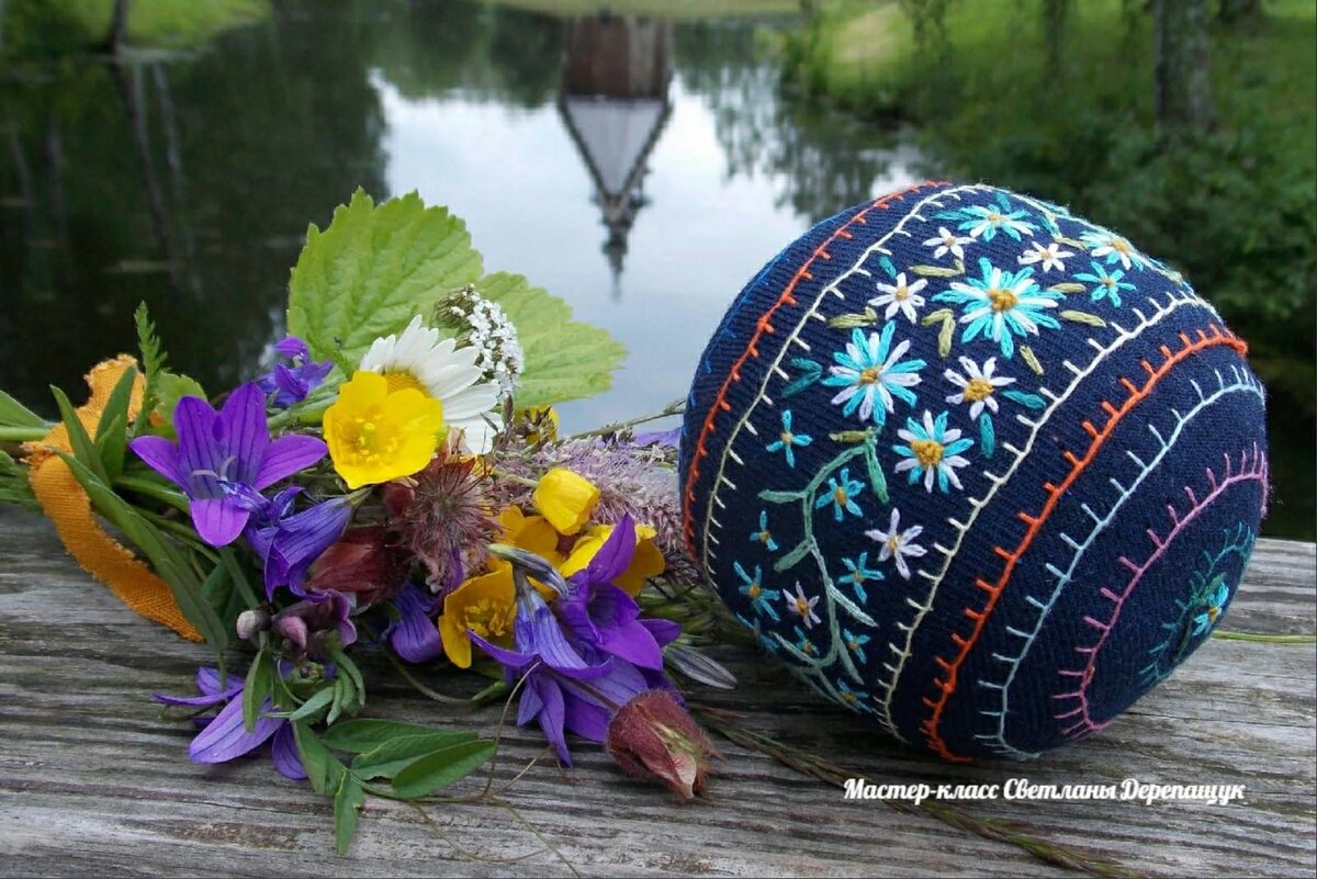 Мяч на фото выше вышит тамбурным швом, вдохновением послужила традиционная костромская роспись с разбелом