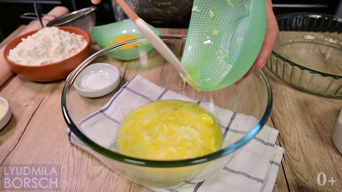 Этот рецепт был на моем столе на День рождения. Понравилось всем, ещё и мало было. А получилось все совсем случайно. Сначала хотела что то вроде пирожков замутить, а тут смотрю не успеваю, но продуктов было жалко и решила вот так по-быстрому и в духовку. Получилось просто потрясающе! Обязательно приготовьте, и у вас получится аппетитное, вкусное блюдо, которое с лёгкостью займёт своё достойное место в числе любимых. Желаю вам приятного аппетита и удачного приготовления. Начнем с приготовления теста. В глубокую миску вливаем растопленное сливочное масло. Солим и вливаем сметану с яйцами Теперь перемешаем. Сюда просеем муку, и добавим две чайные ложки разрыхлителя Замесим тесто. Сначала ложкой в миске, а затем, когда станет тяжело, выкладываем тесто на присыпанный мукой стол и продолжаем вымешивать уже руками. Скатываем тесто в шарик и кладем в глубокую миску. Накрываем полотенцем и отправляем на 25-30 минут в холодильник Приступаем к приготовления начинки. Мясо, у меня куриное, отправ