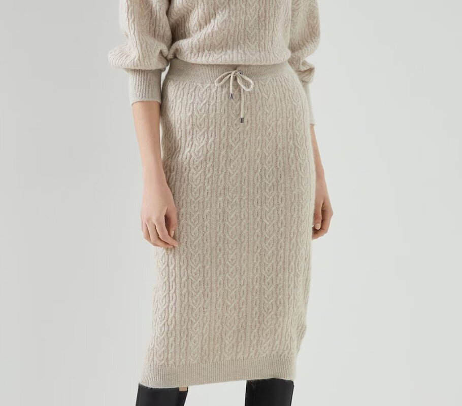 Первая в подборке #юбка - корифея вязаной моды Brunello Cucinelli. Связанная прямым полотном, с большим количеством аранов, снизу собрана резинкой. Стоит эта юбка 1,490 евро.
