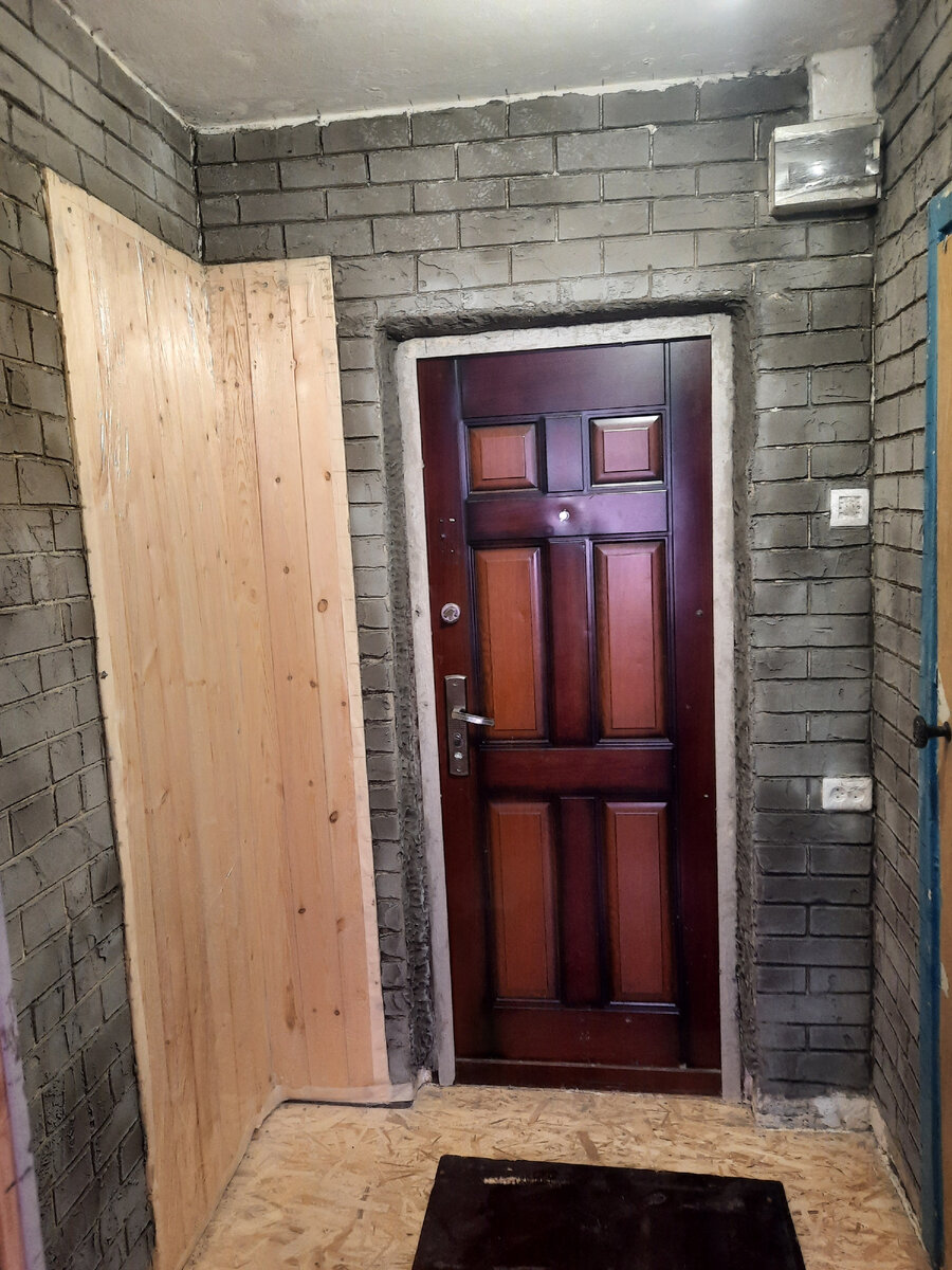Впихнуть невпихуемое, причём очень бюджетно - основная задача данного ремонта для дочки-студентки. За излишнюю экономию в виде советского стола и стула и прочего, прошу не осуждать! Я не миллионер, зарабатываю не много и имею три ипотеки, поэтому экономия - наше всё!))) С чего начинался ремонт, планировка и фото ДО, в ЭТОЙ статье. Начну с коридора. На отделку стен полностью, включая коридор, ушло 8 мешков клея для плитки, недорогого, по 300 рублей. Так выглядят стены до окрашивания. Как делаются описывать не буду, всё это есть в других статьях. Угол, где будет настенная вешалка для верхней одежды, закрыла вагонкой по высоту рядом стоящего шкафа, покрыла матовым лаком. Весь пол покрыли влагостойким ОСБ 12мм, сверху будет подложка и ламинат. Входную дверь оставили. Дверь в санузел, ещё от застройщика! Деревянная, самодельная, хотели в начале заменить, но раскопав как она установлена, да ещё и её нестандартные размеры, решила оставить под покраску! Ибо пришлось бы всю стену к
