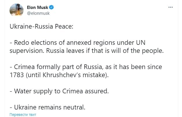 "Крым формально входит в состав России": Илон Маск высказался в Twitter на тему происходящего между Россией и Украиной. Он также предложил некий план для прекращения боевых действий на территории Украины, чем знатно разозлил укров: — Крым формально входит в состав России, как это было с 1783 года (до ошибки Хрущева); — Обеспечение водоснабжением Крыма; — Украина остается нейтральной Он заявил, что если не начать переговоры, то это приведёт мир к ядерной катастрофе. Наш телеграм канал