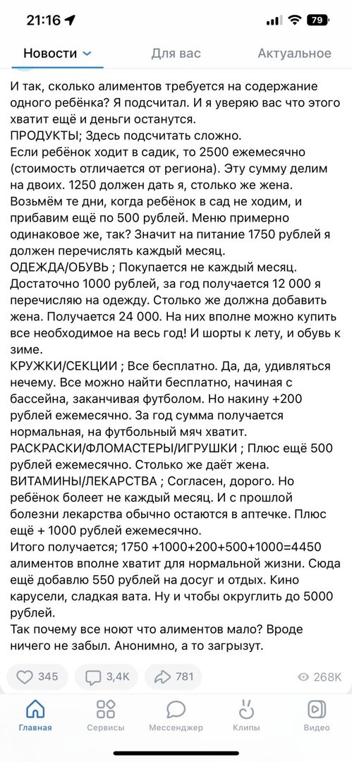 Недавно наткнулась в одном паблика на весьма интересный пост. Похоже так и рассуждают большинство современных алиментщиков: То есть ребёнок питается на 1000 руб. в месяц те дни, которые не ходит в садик? Это чем он питается, мне интересно? А ужин дома после садика? Наверное тем, что сам в мусорке найдет. Пусть крутится с детства. Или ещё на натуральное питание можно перейти - пусть голубей на улице ловит. Выживает сильнейший. Либо надо так, пришел ребенок в 19 часов из сада и сразу спать лёг. И кушать не просит. Да мой кот ест на большую сумму в месяц. Даже по мнению государства прожиточный минимум на ребёнка больше, чем у этого недопапаши. Особенно меня умилил пункт "Одежда-обувь - 1000 р.". Интересно, этот мужик когда последний раз в магазинах был? Сюдя по всему, в 1998 году, и походу ему продавали торгаши родственники с рынка. Так он еще и пишет, что одежда покупается не каждый месяц, прошу заметить. Получается надо год копить, чтобы купить ребёнку на зиму с этих выплат одежду. И, д