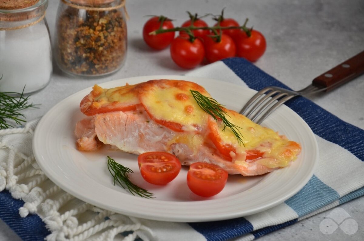 Ингредиенты Пошаговый рецепт приготовления Охлажденную семгу без костей и кожи посолите, присыпьте специями, травами, сбрызните лимонным соком и оставьте на 10 минут. Положите кусочки семги в формочки из фольги, смазанные изнутри растительным маслом. Ломтики лимона можно положить сюда же. Помидор нарежьте тонкими ломтиками и выложите их сверху на рыбу. Посыпьте тертым сыром. Отправьте заготовки в духовку и запекайте рыбу при 180 градусах 20 минут. Сразу после духовки семга готова к подаче. По желанию ее можно достать из формочек, переложить на тарелку и добавить зелень и свежие овощи.