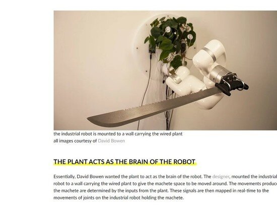 Инсталляция дизайнера и роботехника Дэвида Боуэна «Растение Мачете» позволяет живому растению перемещать мачете через бионическую руку. В установке реализована система управления, которая измеряет электрические шумы, встречающиеся в живом филодендроне. В этой системе используется микроконтроллер с открытым исходным кодом, подключенный к растению, который считывает сигналы переменного сопротивления на его листьях. Движения машины осуществляются с помощью специальной технологии, которая преобразует электрические сигналы в движение в реальном времени. Встроенные накладные датчики улавливают электрические сигналы от листьев и передают их на машину, которая содержит несколько шарниров, определяющих, как мачете качается, наносит удары, разрезает и взаимодействует в пространстве. По сути, Дэвид Боуэн хотел, чтобы растение действовало как мозг робота. Дизайнер прикрепил промышленного робота к стене, несущей проводное растение, чтобы мачете можно было перемещать. Движения , производимые мачете,