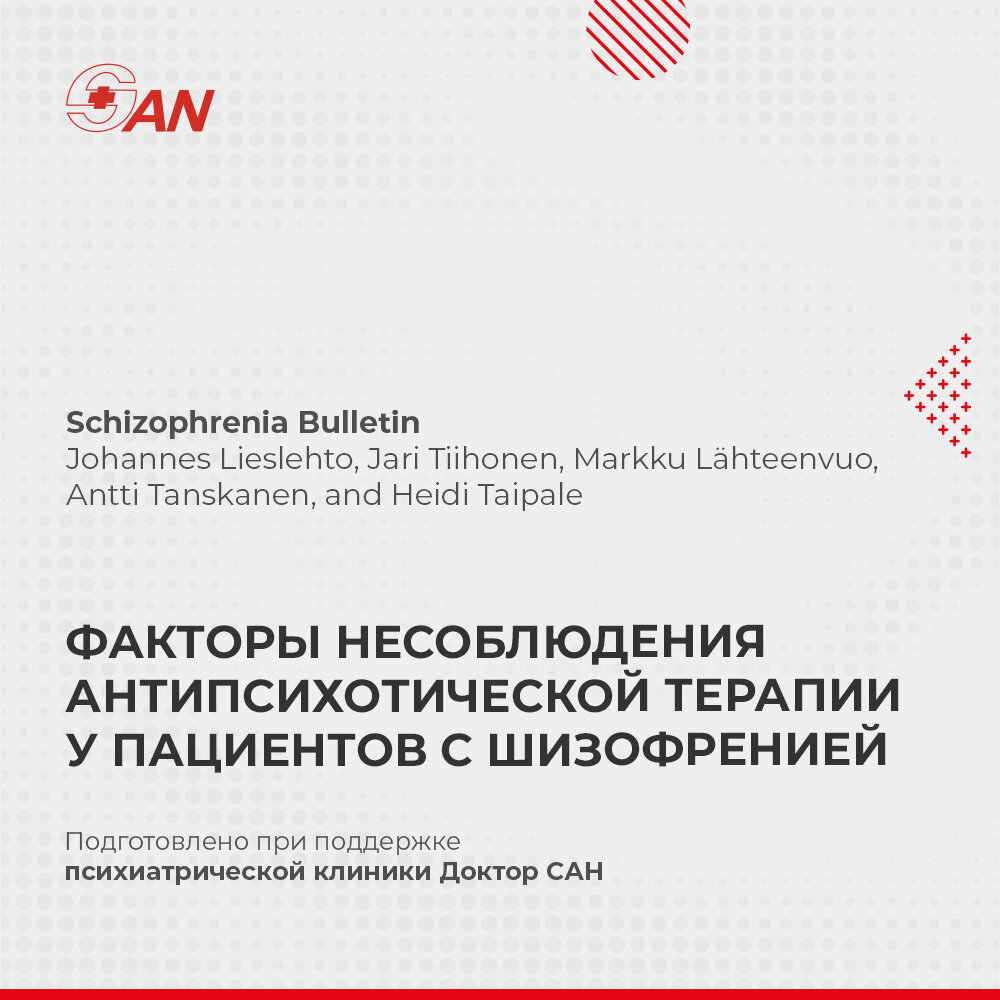 Данные анализа электронных карт пациентов показали, что 31,7% (N = 9506) пациентов продемонстрировали несоблюдение режима лечения любым из назначенных им нейролептиков. Обнаружено, что молодой возраст, сопутствующий прием бензодиазепинов и стабилизаторов настроения, злоупотребление психоактивными веществами, предшествующая попытка самоубийства, диабет, астма/ ХОБЛ и сердечно-сосудистые заболевания были связаны с первичным несоблюдением режима антипсихотической терапии. Пациенты, принимавшие клозапин, демонстрировали самую низкую приверженность к лечению, а пациенты, применявшие инъекционные препараты длительного действия, были более привержены к лечению по сравнению с соответствующими пероральными препаратами. Подробнее о лечении шизофрении: https://doctorsan.ru/lechenie-prostoy-shizofrenii