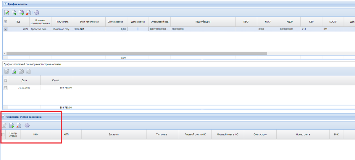 Описание: APK_3890_1153. На вкладке «Платежные реквизиты» в блоке «Реквизиты счета заказчика» должны быть указаны реквизиты открытого в установленном порядке в Федеральном казначействе лицевого счета получателя бюджетных средств. Необходимо заполнить новый блок в контракте на вкладке Финансирование: