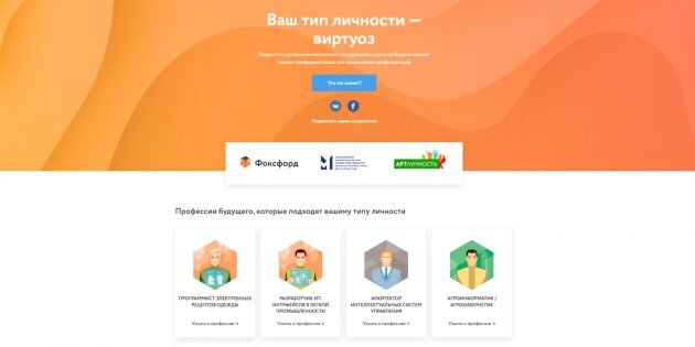 Платный тест от известного портала вакансий, который поможет найти своё истинное призвание. Прохождение занимает около часа, а по итогам сервис предоставляет подробный отчёт. Помимо личностных и интеллектуальных характеристик, в нём есть список рекомендуемых профессий и подсказки по саморазвитию.
