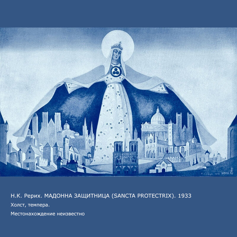 Картина Н.К.Рериха «Святая Покровительница (Sancta Protectrix)». Под своим покровом она охраняет все творения своих детей. «Мадонна Орифламма»: женщина держит Знамя Мира, Знамя грядущего синтеза, Знамя охраны Культуры.