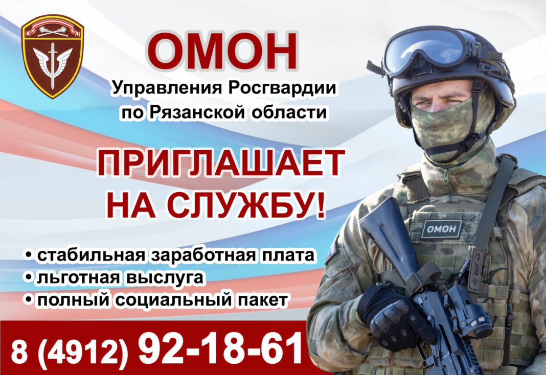 В Рязани осуществляется набор граждан для прохождения службы в Отряде мобильном особого назначения. Требования: граждане Российской Федерации, прошедшие службу в Вооружённых силах РФ, имеющие образование не ниже среднего, с отсутствием судимостей, годные по состоянию здоровья (категория здоровья «А»). Сотрудникам предоставляются все социальные гарантии и бесплатное медицинское обслуживание. Льготный стаж службы: один год за полтора (возможен выход на пенсию через 12,6 лет службы). Ежегодный оплачиваемый отпуск от 40 календарных дней без учёта дороги. По вопросам поступления на службу обращаться по телефону: 8 (4912) 921861.