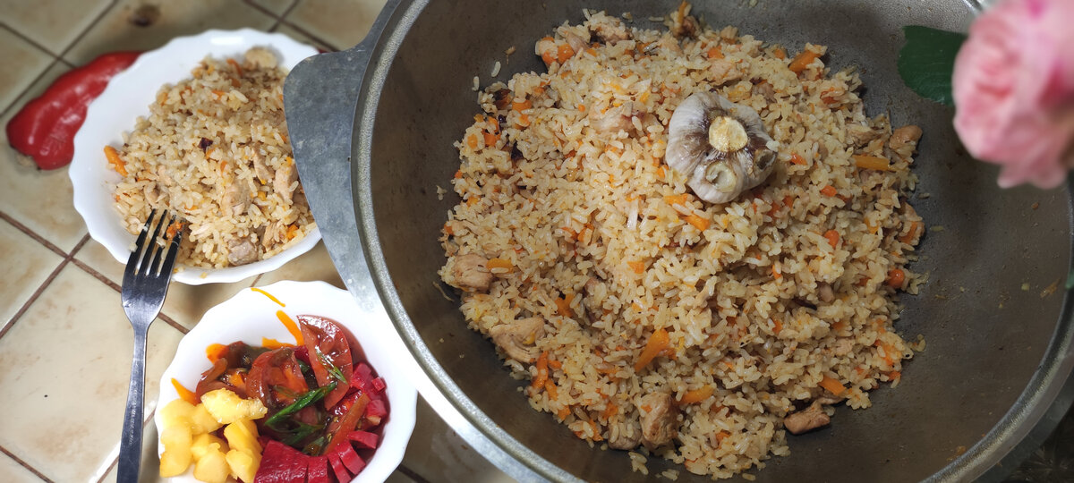 Вас ждет отличный, диетический и очень вкусный плов. Для приготовления которого нам потребуется: Небольшой кусочек сала 50-70 грамм, режим небольшими кусочками. Затем кидаем его в казан или любую емкость желательно с толстым дном. В заранее разогретое подсолнечное масло и начинаем томить на медленном огне. В это время, режим морковку я предпочитаю полосками. Лук режим произвольно. По весу лука и морквы примерно по 500-600 грамм каждого. Режим индейку, я предпочитаю на небольшие кусочки. Примерно 500 грамм. Вытаскиваем сало, оно не должно сильно поджарится все-таки у нас диетический плов. Обжариваем индейку, как только она схватилась переворачиваем, и томим на среднем огне около 10 минут. Вытаскиваем индейку и перекладываем в отдельную емкость. Добавляем немного масла и начинаем пассировать лук. Можно добавить четверть чайной ложки сахара для более глубокой карамелизации. Когда лук потемнел, добавляем морковку и продолжаем пассировать на среднем огне периодически помешивая. Примерно че