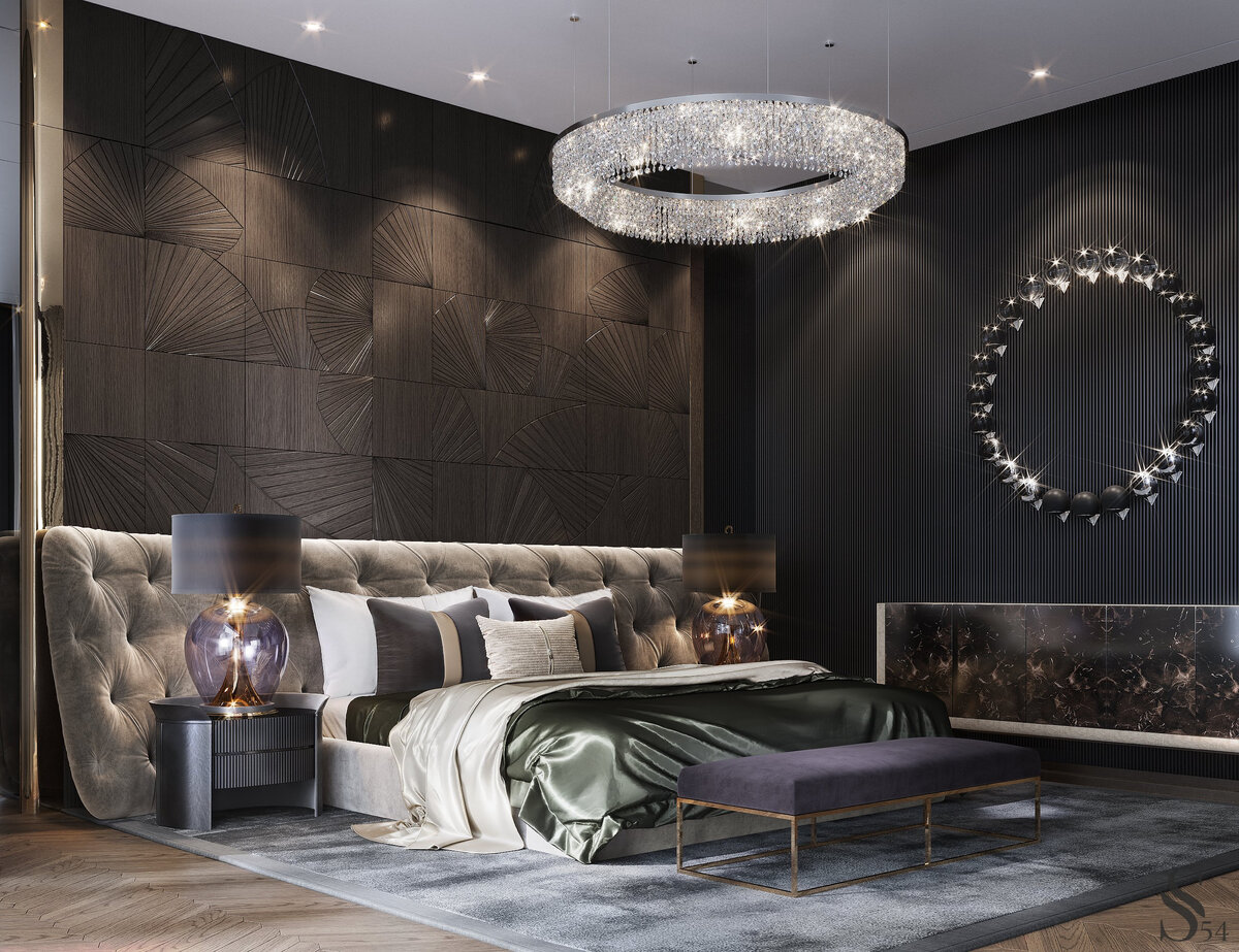 У многих людей спальня ассоциируется со спокойным интерьером в нейтральной цветовой гамме. Иногда это может быть немного скучно. Одну из главных комнат дома можно оформить более выразительно, сохранив при этом расслабляющую атмосферу. Сегодня поделимся с вами примерами дизайна спален от Studia 54, которые могут вдохновить вас на новые решения. Главное - детали Несмотря на темную цветовую гамму и сдержанные оттенки эта спальня выглядит очень эффектно. Все дело в деталях – изысканные стеновые панели с узором в форме веера в стиле ар-деко хочется рассматривать подольше. Круглое декоративное панно на соседней стене из мдф также является «яркой» деталью и делает комнату более интересной. Важную роль в этом интерьере играет и люстра – она придает помещению роскоши и выглядит при этом не вычурно, даже лаконично.Кристаллы отражают свет и создают красивые переливы. Всего несколько деталей способны вывести ваш интерьер на новый уровень. Цветные акценты Для любителей светлых спален у нас также ес