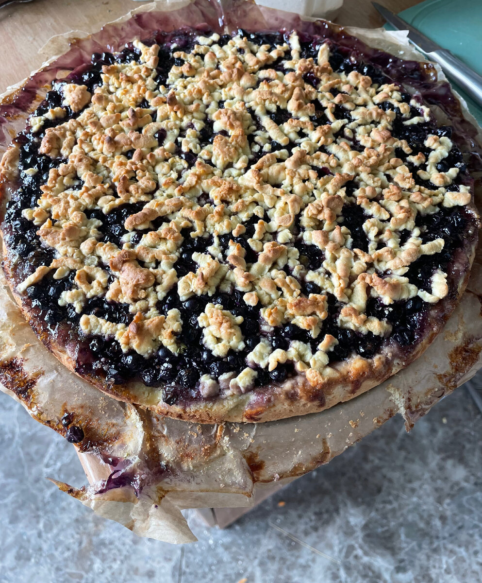 Ягоды в миске смешать с сахаром и крахмалом (крахмал нужен, чтобы ягоды не растеклись в процессе приготовления). Выложить ягоды на тесто. Поверх ягод равномерно натереть на терке тесто из морозилки.