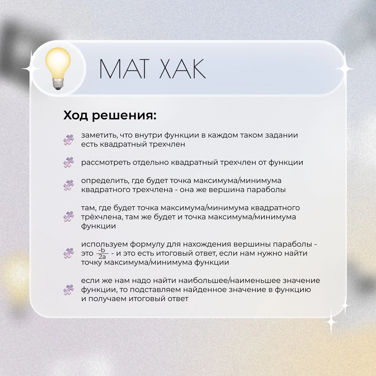 Да-да, вы все верно прочитали :) есть определенный вид заданий в №11 профильной математики, который можно и нужно решать без производной! Варианты таких заданий и их ход решения вы можете увидеть на картинках к этому посту 👇🏻 Задания взяты с сайта: https://math-ege.sdamgia.ru/