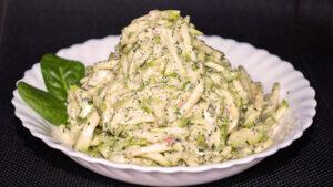 Еще один салатик из кабачков с добавлением яблок. Этот элемент отлично дополняет данное блюдо и придает салату необычный вкусовой шарм. Простота приготовления удивит вас и не потребует лишних денежных затрат. Подробно рецепт тут Рецепт вкусный салат морковка кабачок яблоко