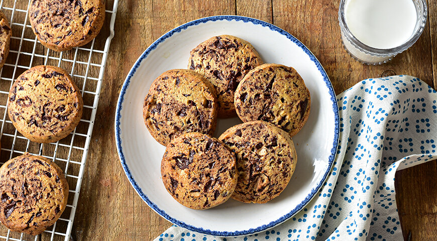 Печенье с шоколадной крошкой еще называют «американским». И действительно, рецепт был придуман домохозяйкой из Соединенных Штатов Рут Вэйкфилд. Ей захотелось порадовать семью шоколадным печеньем, но какао, как назло, закончилось. Тогда находчивая женщина решила добавить в выпечку маленькие кусочки шоколада. Печенье так понравилось ее семье, что с тех пор рецепт разошелся по всему миру. Уверены, что хрустящее ароматное печенье с кусочками шоколада не оставит равнодушными и вас. Почему бы не испечь его по нашему рецепту? 😉 Тем более, что он ну очень простой, так справится даже начинающая хозяйка. 👍 Советуем сразу сделать двойную порцию теста: печенье очень быстро исчезает из тарелки. Пошаговый РЕЦЕПТ