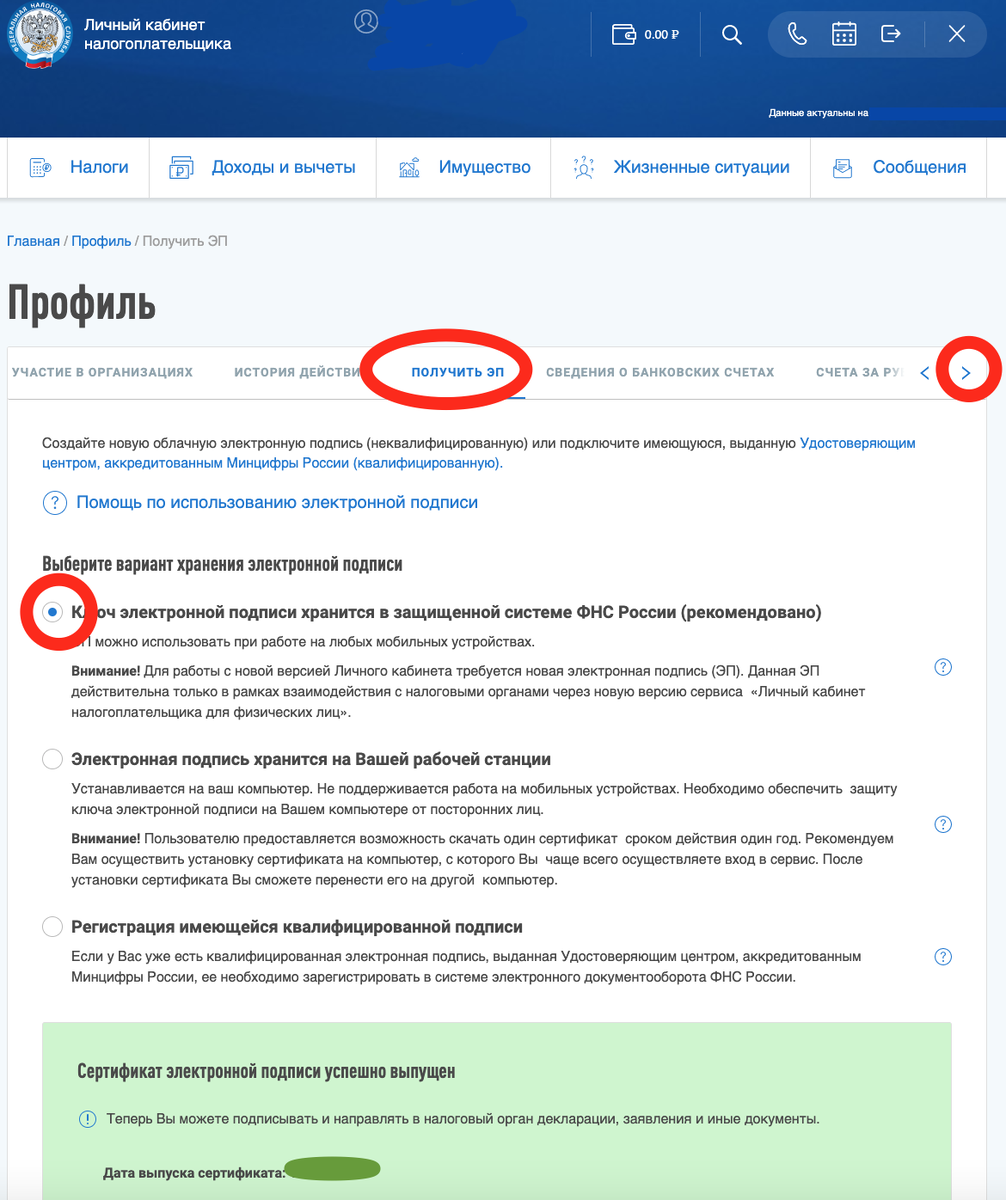 - Затем выбираете "Ключ электронной подписи хранится в защищенной системе ФНС России (рекомендовано)" и выпускаете подпись (сведения о выданной подписи будут отображаться внизу на зеленом фоне).