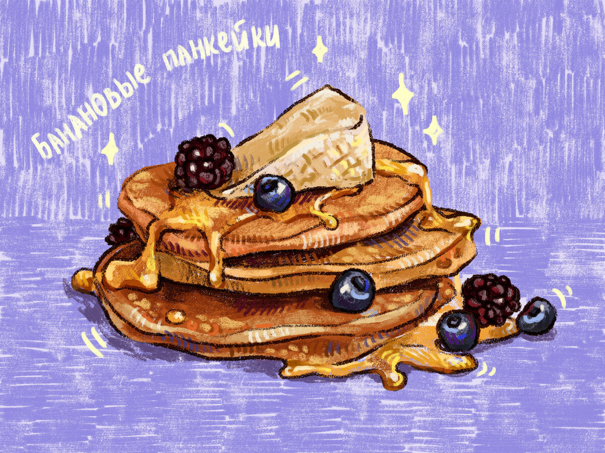 Этот рецепт банановых панкейков я давным давно нашла на просторах интернета. Он прост в приготовлении, и отлично подойдет на завтрак для тех, кто не может жить без сладкого, но при этом хочет чтобы сладость не вредила фигуре. В рецепте я не использую сахар, потому что сладости банана обычно достаточно, но если на ваш вкус сладости маловато, то добавляйте сахар на свое усмотрение. Панкейки получаются нежными и ароматными! Нам понадобится: Для подачи: Я просто обожаю рисовать, поэтому постараюсь иллюстрировать не только готовое блюдо, но и составляющие рецепта. Кстати, как вам интереснее и удобнее воспринимать информацию, через текст или иллюстрации? Давайте приступим к приготовлению: Шаг 1. С помощью миксера взбейте яйца с кефиром и добавьте к этой смеси банановое пюре, предварительно размягчив банан вилкой или блендером. Если вы хотите, чтобы кусочки банана чувствовались в выпечке, то не измельчайте банан слишком сильно. Шаг 2. Постепенно добавьте к банановой смеси муку, разрыхл