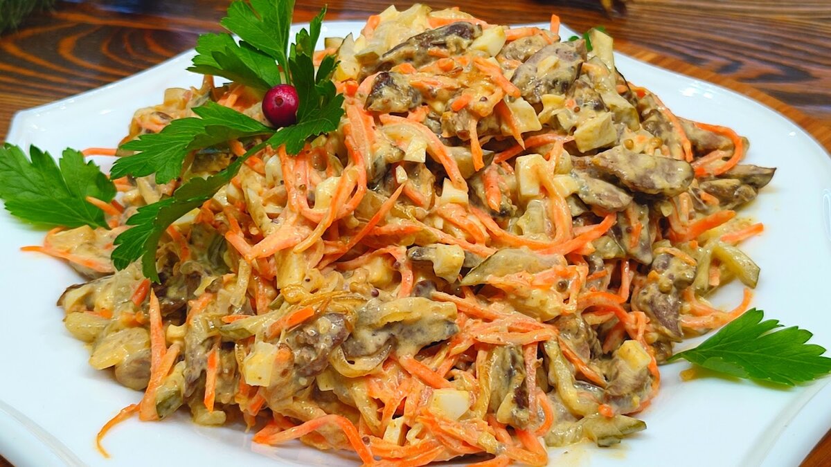 Пикантный салат с куриной печенью и маринованным огурчиком