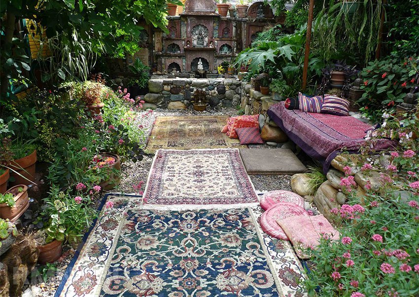 Можно также использовать любую садовую мебель, важно лишь стилизовать ее в восточном колорите. В этом помогут яркие подушки, скатерти с традиционным орнаментом, восточные светильники.
