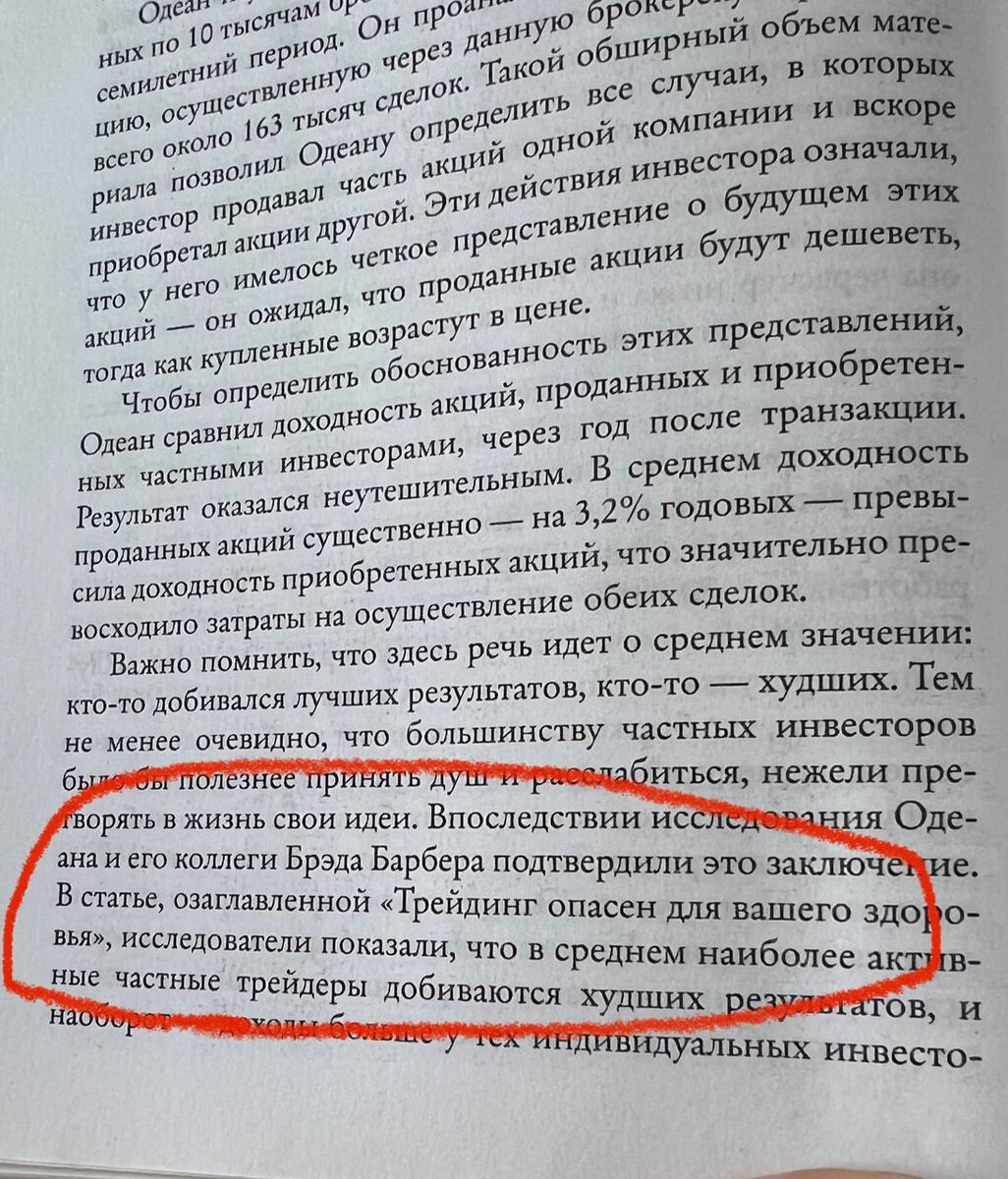 Лауреат нобелевской премии по экономике Даниэл Канеман - известный психолог, в своей книге «Думай медленно, решай быстро» писал об одном исследовании в брокерской фирме на Уолл Стрит Исследователь (Терри Одеан, профессор экономики Калифорнийского университета в Беркли) изучил отчетность о торговых сделках, проведенных по 10 тысячам брокерских счетов частных инвесторов за семилетний период. Он проанализировал каждую транзакцию, осуществленную через данную брокерскую фирму, – всего около 163 тысяч сделок. Результатом иследования стало то, что в среднем активные частные трейдеры добиваются худших результатов, чем инвесторы, совершающие меньше сделок за год. Впоследствии исследования Одеана и его коллеги Брэда легли в основу популярной статьи под названием «Трейдинг опасен для вашего здоровья» Больше полезной инфо в нашем канале https://t.me/kitinvest