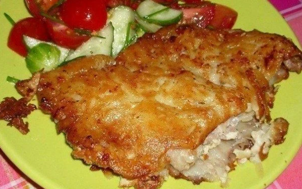 • перец и соль на ваш вкус. Как готовить 1. Куски мяса немного отбейте и обсыпьте специями. Отложите пока на тарелочку. 2. Очистите картошины и крупно натрите в миску. Посолите, накройте, не трогайте 10 мин, жидкость сцедите. 3. Покрошите в картофель лук – как можно мельче. Добавьте крупное яйцо, перемешайте. Внесите в массу укроп, его измельчите. По вкусу еще приправьте и перемешайте окончательно. 4. Нагрейте на среднем огне большую сковороду. Вылейте всю порцию масла. Разложите по