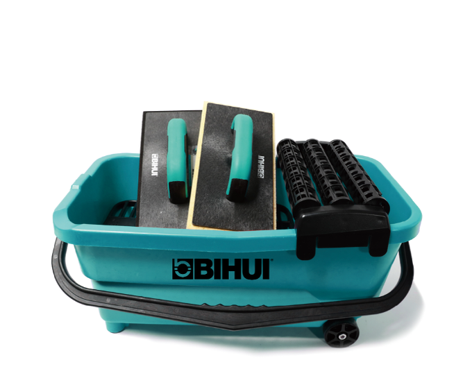 Любую технологическую операцию можно провести с шиком! Даже такую скучную и неприглядную, как финальная очистка плитки от остатков затирки. Для этого существуют специальные наборы. Из чего они состоят? 1. Из пластиковой кюветы, то бишь, обычного легкого и прочного пластмассового ведра на четырех колесиках. Его еще называют скиппером. Объем емкости может составлять от 8 до 40 л! Ручка для переноски кюветы расположена перпендикулярно оси, на которую надеты колесики - так меньше риск ее случайно перевернуть. На дне установлена съемная решетка, она задерживает твердые осадки. 2. Из свободно вращающихся роликов для отжимания воды. Держатели роликов усилены и могут выдерживать довольно большое давление при отжиме. 3. Из одной или нескольких терок с разной поверхностью. Например, в набор могут входить резиновая тёрка для обычной и эпоксидной фуги и пластмассовая, с покрытием из гигроскопичной губки. 4. Из дополнительных аксессуаров. В состав некоторых наборов включена швабра со складной ручко