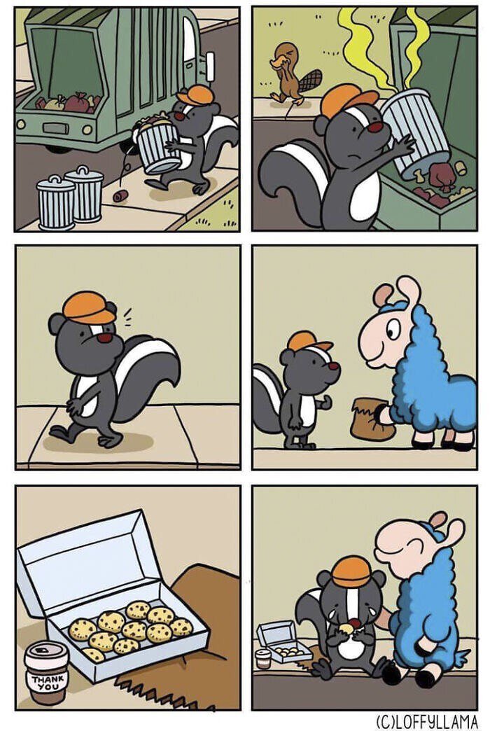 Кто там сказал, что красота спасёт мир? Поговаривают, это был Фёдор Михайлович Достоевский, но это не точно. А может быть в этой затёртой фразе должна быть не красота, а доброта? Да, с добротой звучит, не так красиво. Но, не знаю как там на счёт мира, но меня доброта периодически спасает. Причём в большей степени это работает не тогда, когда кто-то добр ко мне, а когда я сам могу проявить о ком-то заботу и быть полезен. Так вот в очередной раз хочу поделиться с вами капелькой доброты своей и других авторов милых комиксов. В начале сентября в российских школах проходила акция "Спасибо за заботу". Ученики в различных интересных форматах благодарили технический персонал школ: поваров столовой, охранников, уборщиц и т.д. Думаю, прекрасной иллюстрацией этой акции стал бы комикс от LoffyLlama. Было бы здорово, если бы не только школьники и не только в рамках акции с уважением и благодарностью относились бы к работникам не самых престижных профессий. А если рядом нет человека, нуждающегося в