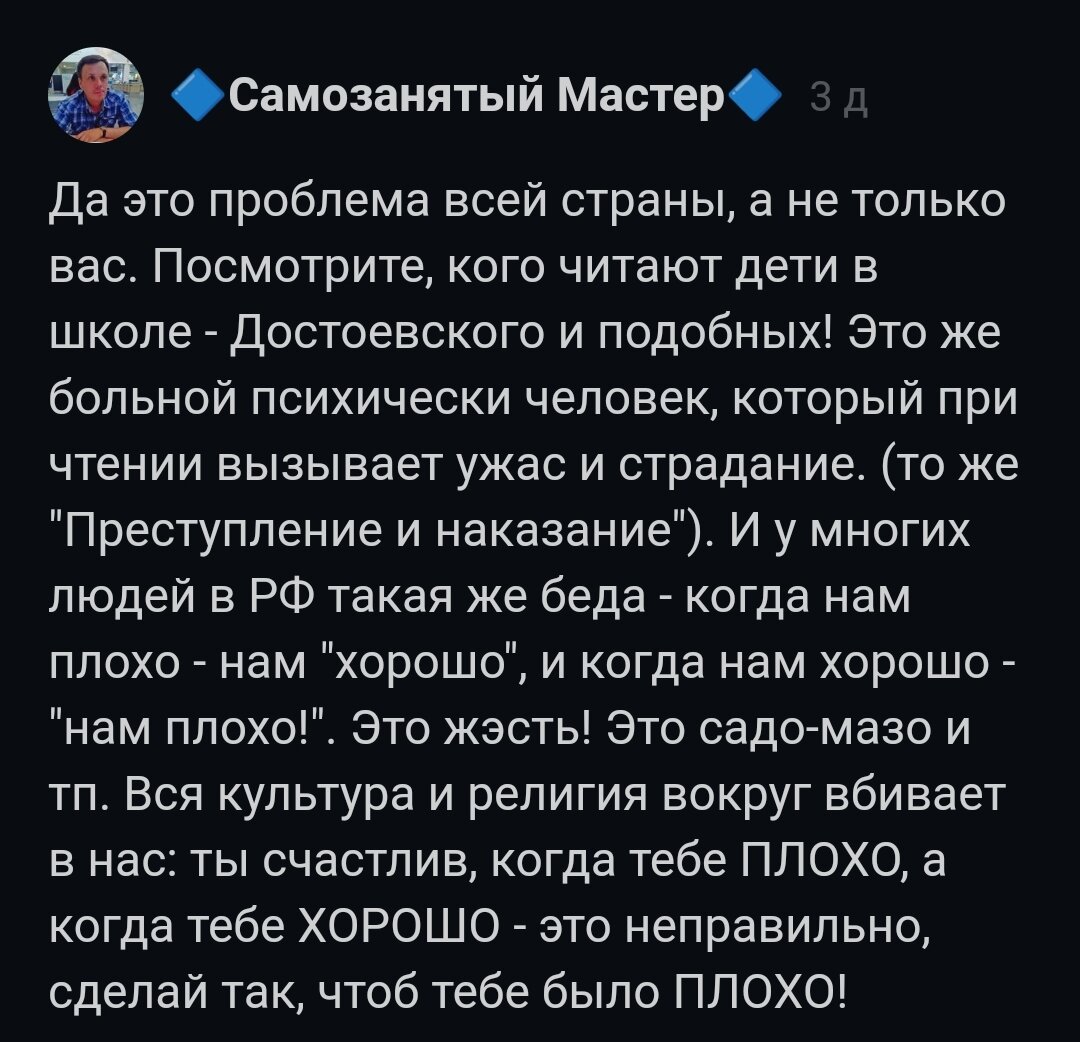 Я читала "Войну и Мир" в школе, еще и по своей инициативе. Странно? Может быть. Но увидела там совсем не то, что увидела сейчас. Я долго откладывала прочтение и вот именно сейчас ее взяла в руки. Количество французского и сносок просто сводит с ума. А я в универе еще как-то "Камо Грядеши" на латыни читала. Вот как? Понятия не имею. Ладно, лирика. К сути. Открытия у меня начали с самых первых страниц. Как можно быть здоровой... когда нравственно страдаешь? Говорит на самых первых страницах Анна Павловна. И тут я подумала, что люд наш русский все время страдал везде. Во всей нашей школьной программе постоянно кто-то ноет, прогибается. Я никогда не забуду ситуацию на уроке литературы, когда учитель при разборе очередного произведения сказала: Покончить с собой - это героизм У меня тогда уже возникли вопросы к русской классике. А сейчас они обостряются еще активнее. В одной из мох статей читатель обратил внимание на этот факт тоже. Прикреплю скрин Не перепишешь, нужно менять учител