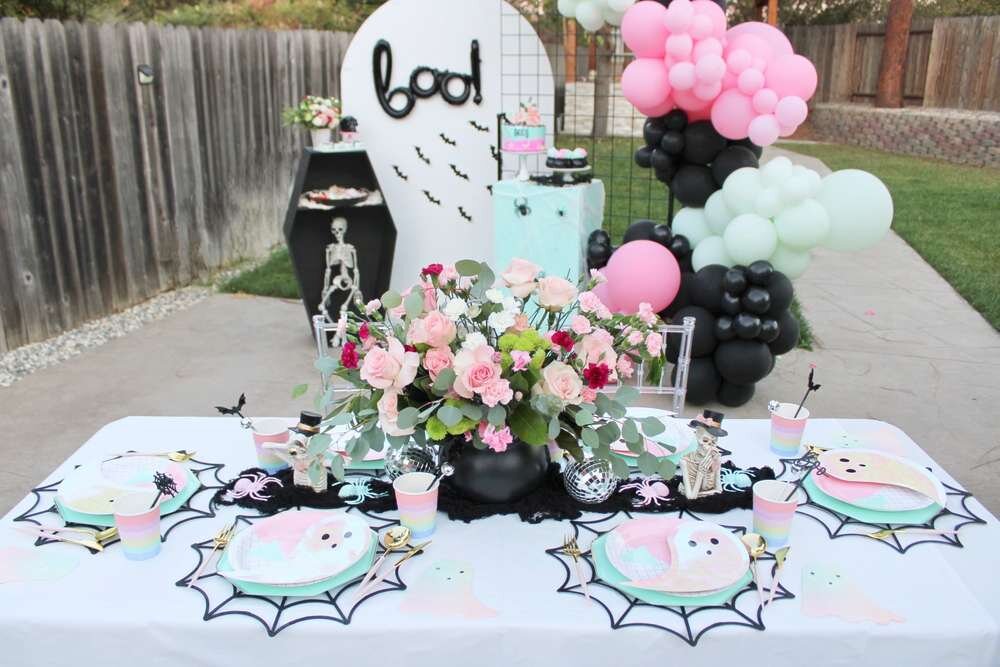 Нежный Хэллоуин в розовых тонах и с букетами живых цветов — это идеальный вариант, чтобы порадовать девочек! Для нас этот праздник не страшный, а стильный и милый. Стол украсила посуда от Meri Meri: невероятные тарелочки-привидения в сочетании с базовыми мятными, стаканчики с бахромой и милые салфеточки-призраки. Все угощения тоже были в пастельной гамме, чтобы сочетаться с декором праздника. Стол украсили салфетки-паутинки, которые положили под каждую тарелочку, а по центру стола протянули черную марлевую ткань. Посмотрите, какое волшебное сервирочное блюдо! Оно может стать прекрасным украшением стола. Источник: catchmyparty.com