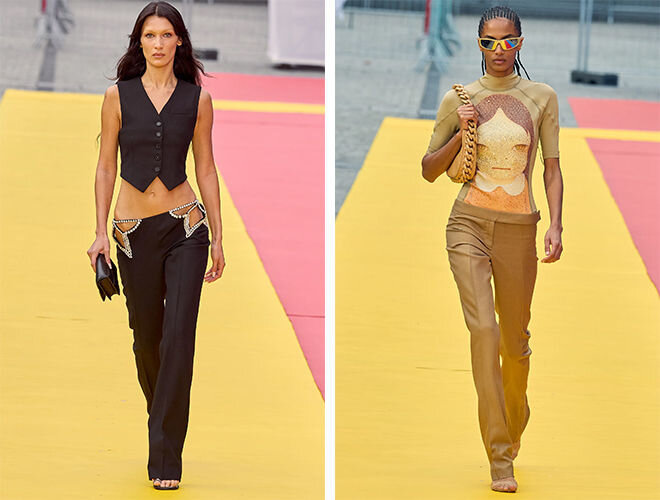 Когда: 3 октября 2022; Где: Неделя моды в Париже; Кто: Стелла Маккартни; Звезды: Белла Хадид, Джиджи Хадид, Джефф Кунс, Джерри Сайнфелд; Стелла Маккартни продолжает топить за экологичность, за что мы ее и обожаем. Ну и за элегантные силуэты тоже. Все, что вы увидите ниже — сделано из растительных материалов (как вам обувь из кожицы винограда?) без использования животного клея и растворителей. Тренды 2023 Заниженная талия Не могу не сказать про заниженную талию, потому что вся коллекция пропитана ностальгией по восьмидесятым-нулевым. Брюки и джинсы в стилизации от Stella McCartney можно носить и в офис: носите их с оверсайз-жакетом и туфлями на каблуке, свободными белыми рубашками и босоножками. Оверсайз-жакет Кстати, про жакеты с мужского плеча! Да, Маккартни в этом плане консервативна и все еще призывает к эстетике 80-х: выверенные силуэты, массивные плечи, объемные формы. Призываю не ждать следующего сезона и носить оверсайз-жакеты прямо сейчас! Гиперболизированные версии выбирать не