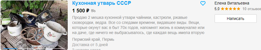 Добрый день (вечер, ночь, утро). Принес вам в клювике очередную порцию трешовых объявлений с Авито. Предлагаю вместе похихикать с них. Как вы думаете, что должно произойти такого, что бы люди не продавали больше мусор?) Хотел бы я такой вопрос задать одному из сегодняшних продавцов "антиквариата" (а может и не одному). Интересно он бы понял, что я намекаю на него... Я вот даже не могу представить, что продают на зарубежных сайтах - барахолках, если у них нет вещей СССР. Это же основной источник дохода на Авито) По прежнему удивляюсь изобретательности продавцов. Вот кто бы мог додуматься продавать такой хлам. А эта торгашка мало того, что додумалась в целом его продавать, так еще и способ применения продумала. Гениально. Только будет одна проблемка. В крэш комнаты берут предметы, которые можно уничтожить. Ее же предметами легче уничтожать все и вся Спонсор сегодняшней статьи. Одно объявление краше другого. Как к этому отнесутся его соседи, что он продает общий диван. А еще объясните мн