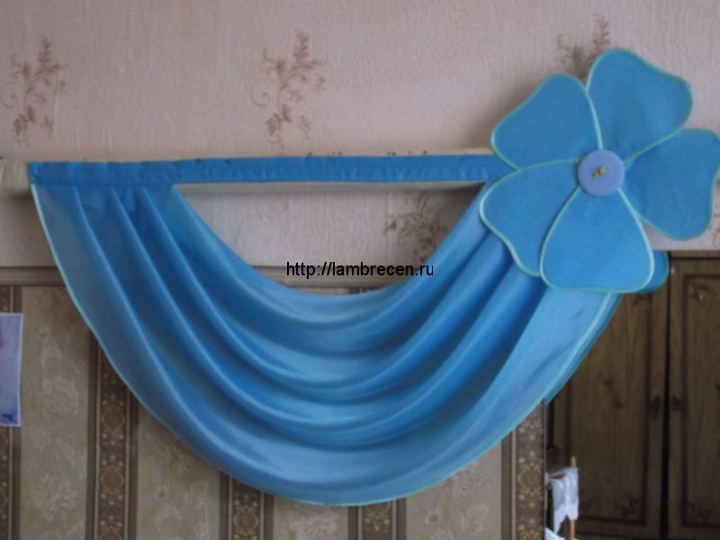 Из данного мастер класса вы узнаете как сшить ламбрекен из симметричного перекида, получив в итоге ламбрекен - перекид, украшенный цветком из ткани: Внимательно смотрите данный шаги, выполняемые в данном мастер классе, чтобы узнать, как изготовить планку со шторной лентой, на которую потом с помощью крючков вы сможете повесить данный ламбрекен на карниз. Выкраиваем перекид с выкройкой со складками - зубчиками таким же образом, как и сваг из предыдущего урока. Выкройку такого равностороннего перекида вы можете изготовить самостоятельно, вырезав середину из выкройки равностороннего свага, который вы можете бесплатно скачать ЗДЕСЬ. 1. Обрабатываем верхний и нижний провисы косой бейкой. после этого обязательно утюжим и даем детали остынуть. 2.На закроечном столе закладываем у перекида складки и закалываем их булавками или наметываем. 3. Закрепляем складки машинной строчкой. 4. Вывешиваем перекид на специальный брусок, для сборки ламбрекенов, обтянутый утеплителем, а сверху тканью.(можно