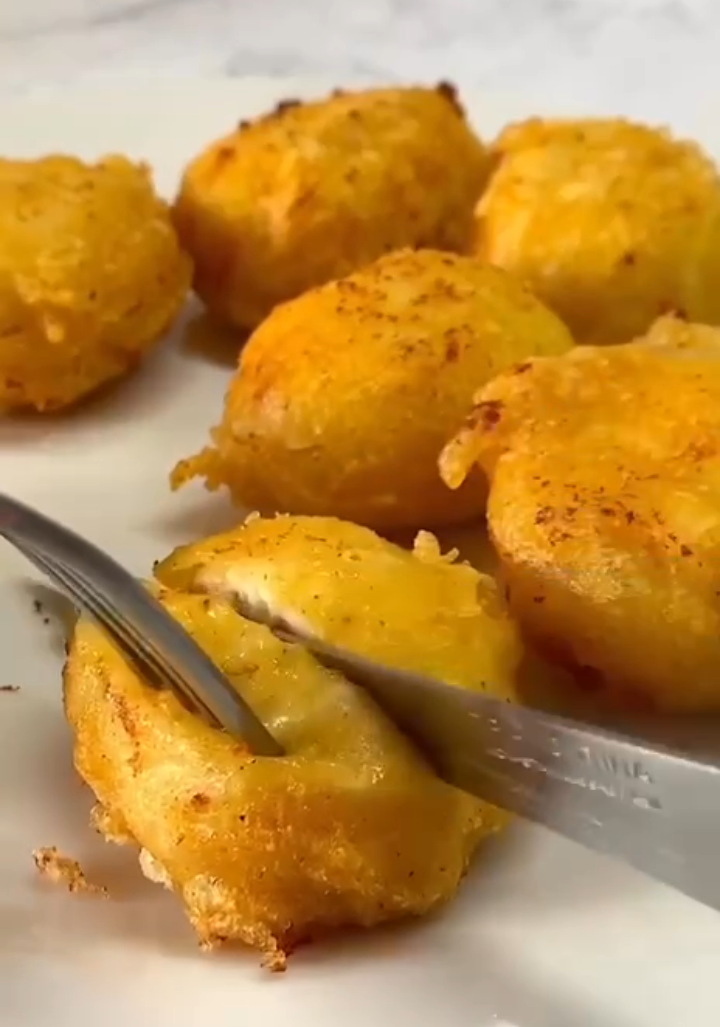 Сочные и хрустящие куриные наггетсы с сыром Ингредиенты: Куриная грудка/филе 250 гр Сухой чеснок 1/3 ч.л. Паприка 1/3 ч.л. Соль Сыр 50-70 гр Растительное масло Панировочные сухари 40 гр Для кляра: Крахмал 20 гр Мука 50 гр Вода 50-60 мл Паприка 1/2 ч.л. Острый молотый перец Куркума 1/3 ч.л. Соль 🌿Приготовление: 1.Куриную грудку/филе режем на средние кусочки, перекладываем в блендер и прессовавших. 2.Добавляем специи: соль, паприку и сухой чеснок и перемешиваем. 3.Руки смазываем растительным маслом. Берём немного фарша и в серединку вкладываем кусочек сыра. Придаём форму. 4.Обваливаем в панировочных сухарных. 5.Готовим кляр. Смешиваем муку, крахмал, куркуму, паприку или острый перец и соль. Затем добавляем воду и перемешиваем. 6.Куриные заготовки окунаем со всех сторон в кляр. 7.Растительное масло разогреваем, перекладываем куриные наггетсы и жарим с каждой стороны до золотистого цвета. ⠀ Праздничные творожные шарики! Ингредиенты: 📌360 г творога 📌2 ст.л. сахара 📌1 яй