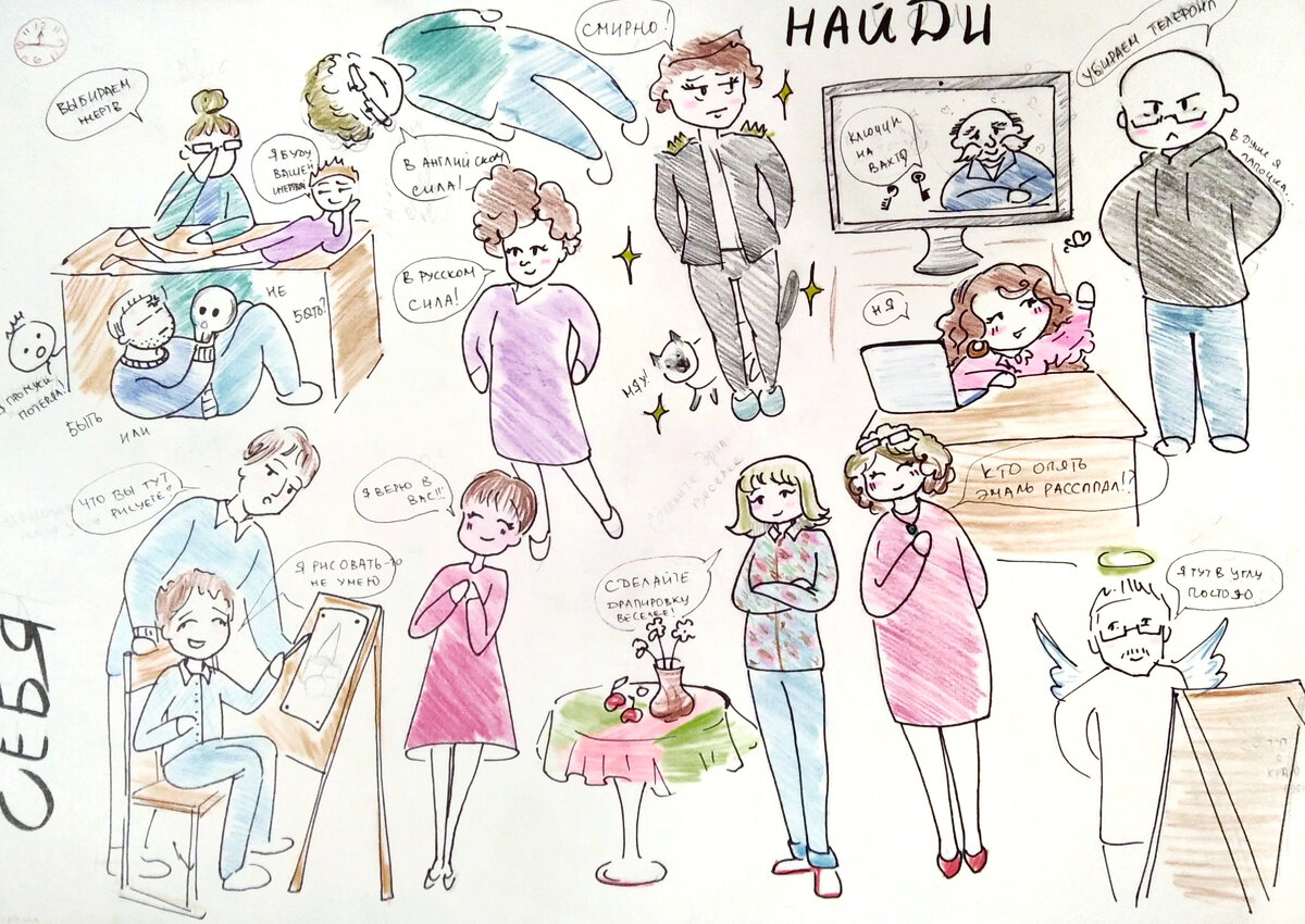 В предверии наступающего Дня учителя мы с одногрупницами нарисовали шуточную поздравительную открытку для наших преподавателей. На ней изображены все педагоги, как мы их видим, с коронными фразочками и в любимой одежде. Работа совместная и, как всегда, делалась в последний момент, а потому кривенькая, но с душой. Завтра ещё покажу открытки для преподавателей, сделанные мной. Всем творчества!)