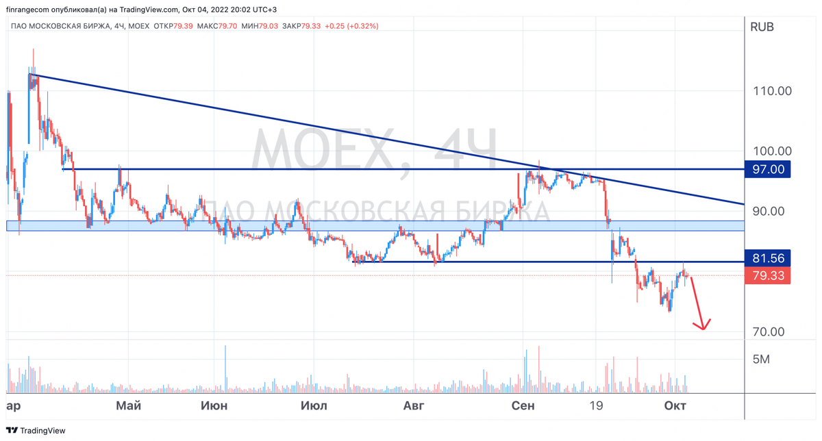 Рост объёмов на фондовом рынке обусловлен высокой волатильностью ценных бумаг и паническими распродажами, связанными с объявлением частичной мобилизации в России. Убрать этот фактор, суммарный объём упал бы сильнее. Соответственно, ждём дальнейшего снижения объёма торгов на Московской биржи и падения финпоказателей. На фоне этого ожидаем снижения котировок компании. С технической точки зрения, акции МосБиржи протестировали роувень сопротивления после пробоя. Д