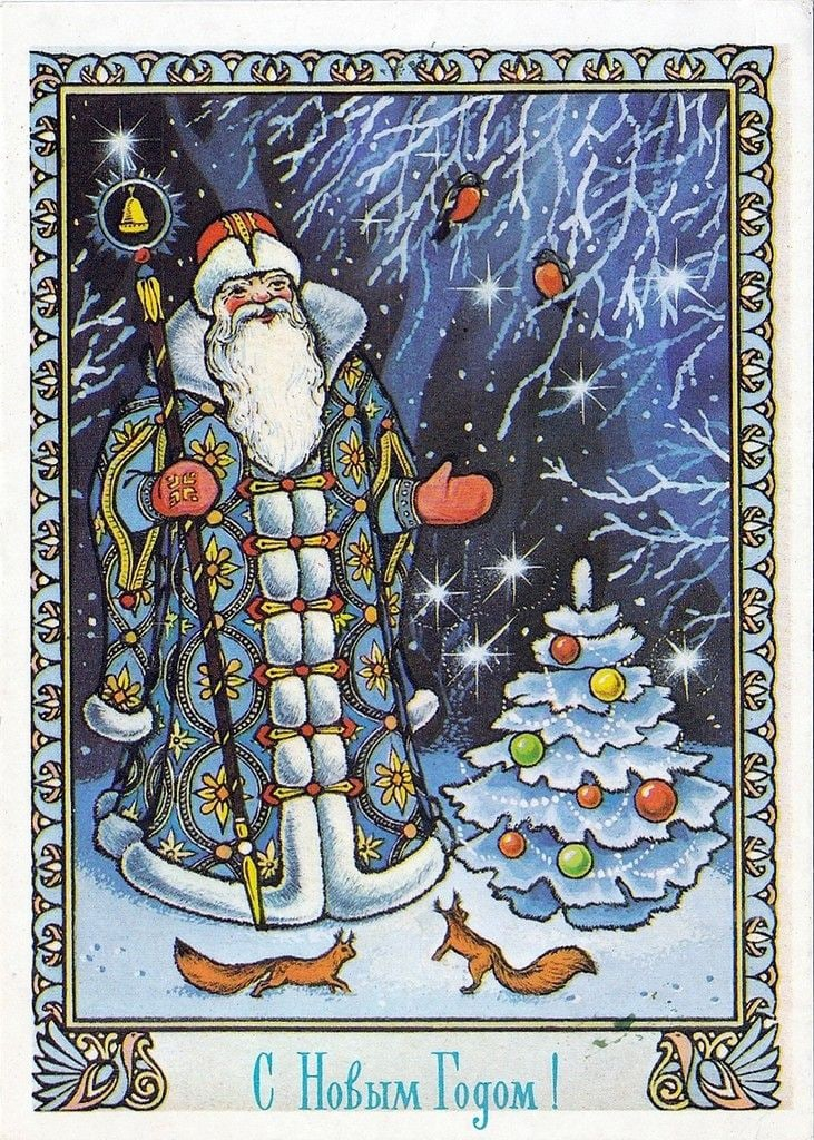 Каждая открытка может стать маленьких шедевром, если она красиво нарисована и интересно оформлена. И тема нашей подборки сегодня - новогодние открытки с декоративными узорами. И откроет ее этот чудесный Дед Мороз в обрамлении резного узора с волшебными птицами. А вот и мальчик-годовик, любимец детворы. А орнамент по краям открытки - узнаваемые городские пейзажи. Интересен и Дед Мороз в раме из снежного узора у огромных часов. Город с его строгой архитектурой хорошо вписывается в новогодние поздравления, и мы уже рассказывали о Москве и Ленинграде на открытках. Новый год приходит не только в большие города. Он не забывает и маленькие деревушки, и поселки, и дальние станции, и всегда приходит вовремя. И вот такие чудесные картины можно увидеть где-то в глубинке - окно с наличниками, наряженная ёлочка, уют и покой. Или это сон из детства? И в нем самый просто деревянный домик - сказочный терем, и каждый день происходят чудеса... А вот и красавицы на наших открыточках. Здесь и рябина, и