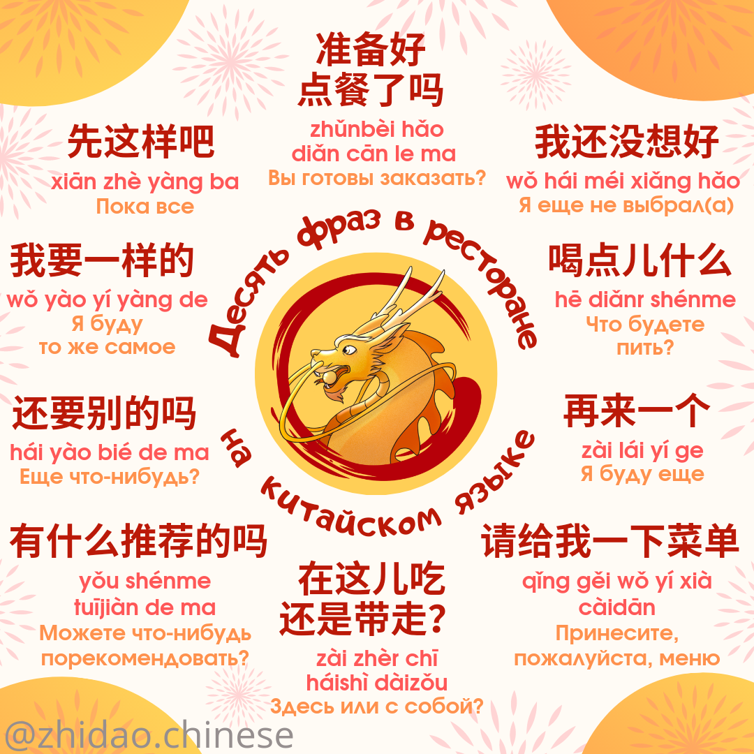 #zhidao_способы_сказать ? Сегодня делимся с вами восемью фразами, которые пригодятся вам в ресторане или кафе/столовой! 😋 1️⃣ 准备好点餐了吗 zhǔnbèi hǎo diǎn cān le ma Вы готовы сделать заказ? 2️⃣ 我还没想好 wǒ hái méi xiǎng hǎo Я еще не выбрал(а) 3️⃣ 喝点儿什么 hē diǎnr shénme Что будете пить? 4️⃣ 再来一个 zài lái yí ge Я буду еще 5️⃣ 请给我一下菜单 qǐng gěi wǒ yí xià càidān Принесите, пожалуйста, меню 6️⃣ 在这儿吃还是带走? zài zhèr chī háishì dàizǒu Здесь или с собой? 7️⃣ 有什么推荐的吗 yǒu shénme tuījiàn de ma Можете что-нибудь порекомендовать? 8️⃣ 还要别的吗 hái yào bié de ma Еще что-нибудь? 9️⃣ 我要一样的 wǒ yào yí yàng de Я буду то же самое 🔟 先这样吧 xiān zhè yàng ba Пока все 📝 Ссылка на карточки Quizlet для изучения новых слов: https://quizlet.com/_c37cc3?x=1qqt&i=2r5snr ❗В Quizlet вы можете послушать произношение всех фраз! Для этого нажмите на значок микрофона 🔊 📚 Хотите, чтобы Вы или Ваш ребенок заговорили на китайском? Напишите нам для записи на групповые / индивидуальные занятия! 🎓 #china #chinese #школа