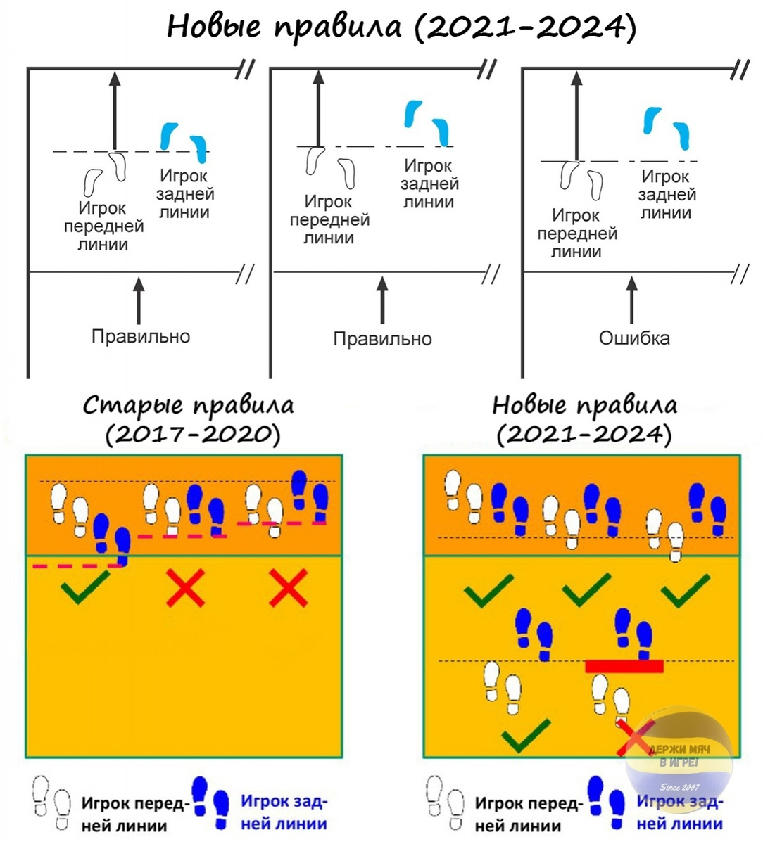 37-м Конгрессом FIVB в 2021 году были приняты обновлённые правила в классическом волейболе, которые будут действовать до 2024 года. И в них есть некоторые изменения по сравнению с правилами 2017-2020. Не все знают об этих изменениях и тонкостях некоторых пунктов, поэтому мы решили ввести новую рубрику и понемногу о них рассказывать. Сегодня рассмотрим пункт правил 7.4.3.1. В старых правилах было написано: «по крайней мере, часть стопы каждого игрока передней линии должна быть ближе к средней линии, чем стопы соответствующего игрока задней линии». Новые же правила гласят так: «каждый игрок задней линии должен быть на одном уровне, или, по крайней мере, часть его одной стопы должна быть дальше от средней линии, чем передняя стопа соответствующего игрока передней линии». Что это нам даёт на практике? Теперь взаимосвязанные игроки передней — задней линии могут находиться на одном уровне на площадке (игроки зон 1-2, 3-6, 4-5). По сути это даже не запрещает всем игрокам стать в одну шеренгу