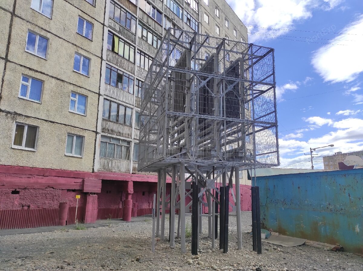 В 2019 году несколько домов в Талнахе оказались под угрозой разрушения. Дело в том, что этот город построен в условиях вечной мерзлоты, которая со временем начинает таять. Растаявший грунт не способен удержать фундамент многоквартирного дома, из-за чего здание начинает проседать и заваливаться набок. Бороться с таянием грунта начали ещё при проектировании Талнаха. Большинство домов приподняты над землёй на сваях, чтобы своим теплом не разогревать вечную мерзлоту. Но иногда это не помогает удержать подземные льды в стабильном состоянии, что вынуждает городские власти прибегать к весьма необычному решению: искусственно заморозить фундамент дома при помощи двуокиси углерода. Эта конструкция во дворе дома на Бауманской 28 как раз является частью системы охлаждения. Под землей по контуру здания проходит сеть труб с хладогеном, а металлическая надстройка, скорее всего, является теплообменником. Интересно, как к этому соседству с двуокисью углерода относятся жильцы дома. Но выбора у них не бы