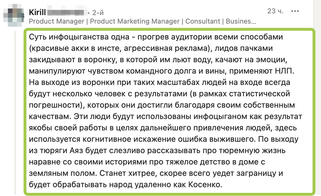 По поводу инфоцыган... Как же верно пишут, не могу не поделиться. "...Суть инфоцыганства одна - прогрев аудитории всеми способами (красивые акки в инсте, агрессивная реклама), лидов пачками закидывают в воронку, в которой им льют воду, качают на эмоции, манипулируют чувством командного долга и вины, применяют НЛП. На выходе из воронки при таких масштабах людей на входе всегда будут несколько человек с результатами (в рамках статистической погрешности), которых они достигли благодаря своим собственным качествам. Эти люди будут использованы инфоцыганом как результат якобы своей работы в целях дальнейшего привлечения людей, здесь используется когнитивное искажение ошибка выжившего." Скажу так - это очень выгодный бизнес, т.к. себестоимость стремиться к нулю с каждым новым оболваненным :) Русский ИТ бизнес