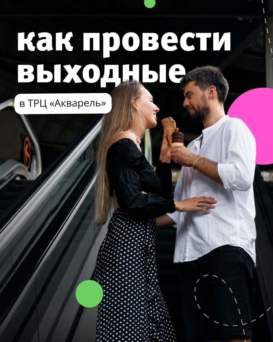 Беспроигрышный вариант: организовать поездку в ТРЦ «Акварель». У нас есть всё, чтобы сделать ваш уикэнд интересным и ярким. Смотрите карточки и берите наши идеи на заметку!