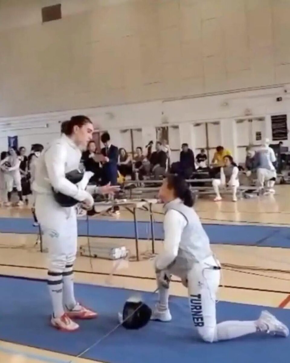 Рапиристка Стефани Тёрнер выступала на соревнованиях, проходящих под эгидой Федерации фехтования США. Когда сетка свела её с трансгендером Редмондом Салливаном, она встала на колено и отказалась от поединка.