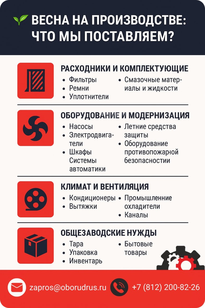 🍀 ВЕСНА НА ПРОИЗВОДСТВЕ: ЧТО МЫ МОЖЕМ ПОСТАВИТЬ Весной заводы начинают активную подготовку к новому производственному сезону. А мы — к быстрым поставкам нужного оборудования и комплектующих. 🔧 Что особенно востребовано сейчас, и что мы можем быстро поставить: ▪️ Запорно-регулирующая арматура — краны, клапаны, задвижки ▪️ Фильтры и вентиляционные элементы — для очистки воздуха и жидкости ▪️ Кабельная продукция и электрика — в том числе для взрывозащищенных зон ▪️ Подшипники и муфты — любые типоразмеры, в наличии ▪️ Промышленные насосы — в том числе дренажные, химические, шестеренчатые 🚗 Всё — в срок, с проверенным качеством и консультацией специалистов. ✉️ Пишите — рассчитаем и отгрузим в кратчайшие сроки!