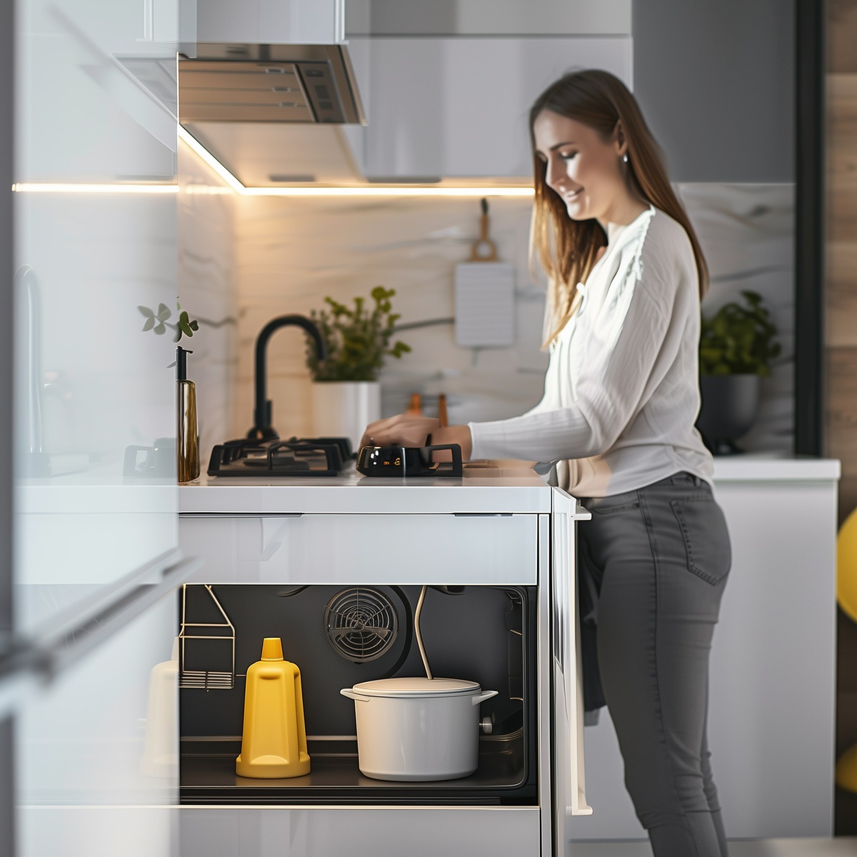 Создано на основе запроса: photo view straight ahead: clean bright modern kitchen, in the kitchen stands a happy woman, at the stove