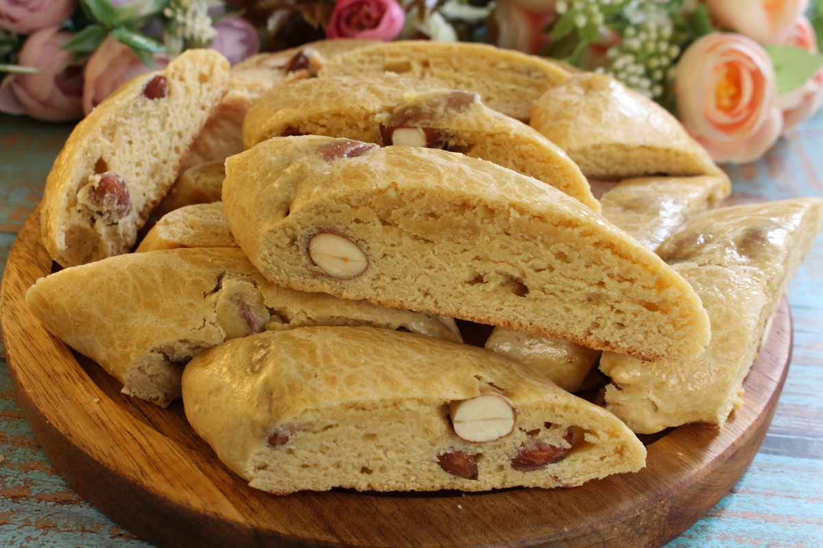Эта выпечка покорит вас своим вкусом и ярким ароматом. Тут в тесто добавляется лимонная цедра, мед и печенье действительно получается душистое. Количество цедры можно увеличить или уменьшить. Готовится печенье быстро и просто, тут ничего не нужно взбивать и даже не нужно ждать, чтобы сливочное масло согрелось. Это печенье можно оставить мягкое, а можно подсушить до более хрустящего состояния. Каждый выберет тот вариант, который по вкусу. Яйцо куриное - 2 шт. Сахарная пудра - 150 г. Цедра лимонная - 0.5 ч.л. Мед - 15 г. Масло сливочное - 50 г. Разрыхлитель - 1 ч.л. Миндаль - 50 г. Соль - щепотка Мука - 275 г. Для смазывания: Яйцо куриное - 1 шт. В чашку вбиваем яйца, добавляем сахарную пудру и соль. Перемешиваем. Сливочное масло растопим, даем немного остыть и вливаем в чашку. Добавим в тесто разрыхлитель и перемешиваем. Добавим в тесто мед и лимонную цедру, перемешиваем. Добавим муку и перемешиваем. Добавим в тесто миндаль и можно уже месить тесто руками. Это тесто не липнет. Миндаль м