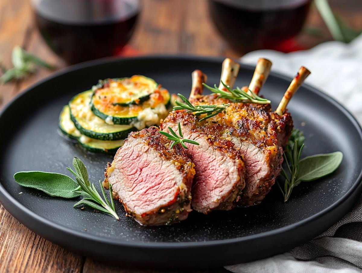 Создано на основе запроса: A gourmet dish of French rack of lamb, perfectly seared with a golden crust, sliced into tender, juicy pieces