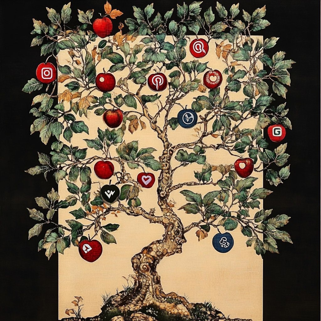 Создано на основе запроса: tree with social media logos in the leaves, Edo period wood block print art piece by artist Utagawa Hiroshim --- Автоперевод: Дерево с логотипами социальных сетей в листьях, Edo Perio Perio Круто выглядит? 🤔 https://dzen.ru/id/65c0c65c86e4f837c27b24d7 #ИИ #AI #нейросеть #midjourney #art