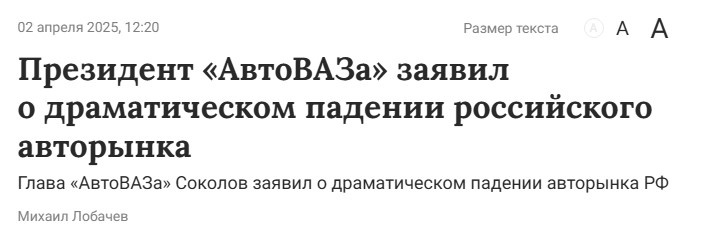 Президент "АвтоВАЗа" Максим Соколов на днях сообщил о резком падении продаж своего предприятия, и заодно - о "драматическом" падении всего российского авторынка. В марте, в сравнении с прошлогодними показателями, продажи АвтоВАЗа рухнули на треть, в первые месяцы года они были еще ниже (по отношению к февралю в марте получился рост 7%). Вот что говорится в пресс-релизе компании: По итогам марта 2025 года в России было продано 28 699 легковых и легких коммерческих автомобилей LADA, что на 7,4% больше, чем в феврале текущего года, и на 33% меньше, чем годом ранее. При этом российский автомобильный рынок показал значительную негативную динамику, сократившись в марте 2025 года на 44,4%*. Всего за I квартал 2025 года реализовано 76 217 автомобилей LADA. При сократившемся за тот же период практически на четверть российском автомобильном рынке (-24,8%*), второй месяц подряд LADA демонстрирует более оптимистичную динамику продаж (-16,8%), наращивая свою рыночную долю, которая достигла 28,7%*.