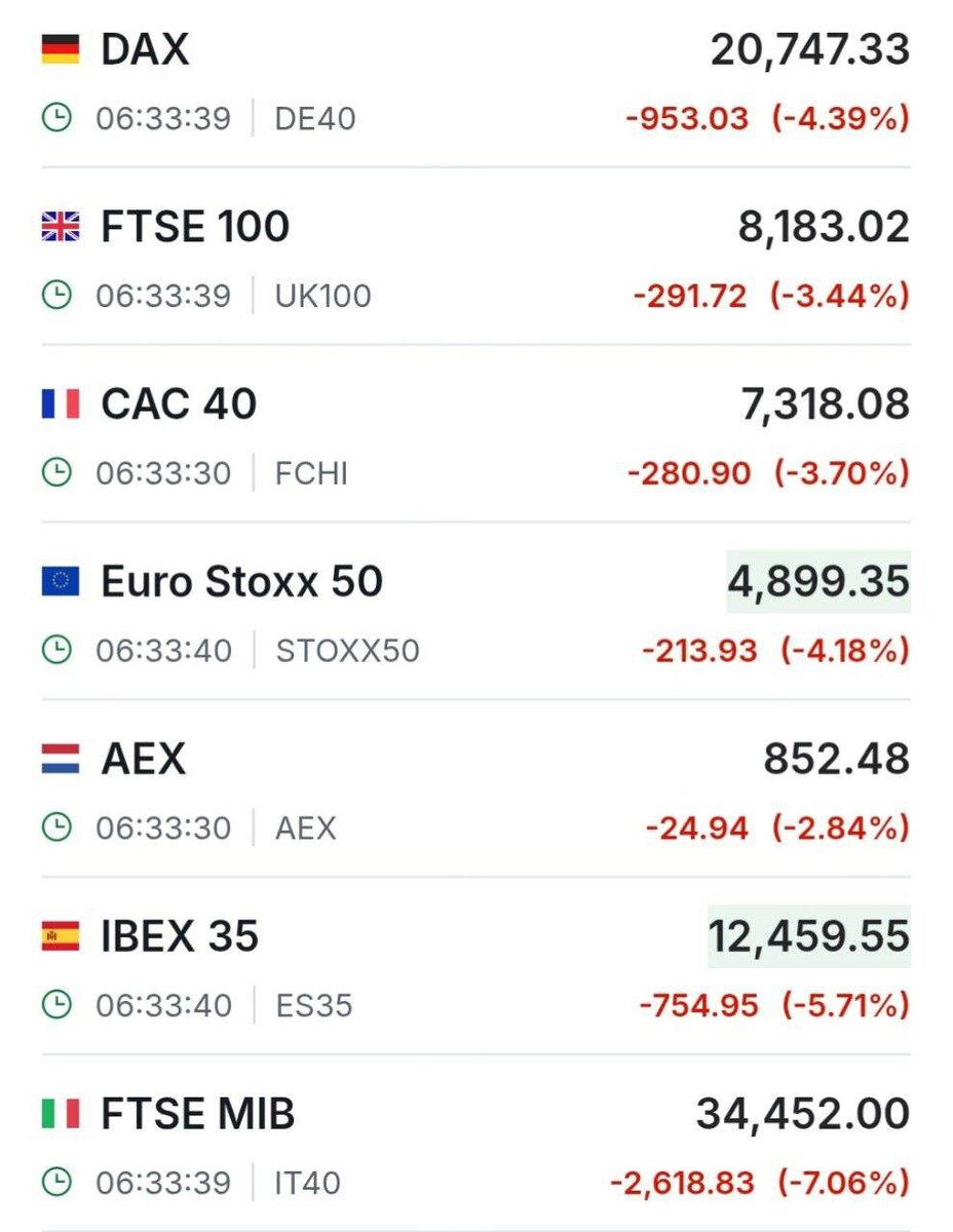 Торговая война, начало: Китай ввел ответные тарифы на всю продукцию США в размере 34%, как ответ на пошлины Трампа. Также минторговли Китая включило 11 американских компаний в список ненадежных организаций за военное сотрудничество с Тайванем. Акции европейских рынков падают, быстрее всех летят Италия, Испания и Германия. Заря | Новости - Подписаться